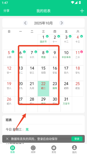 2、在日歷視圖中查看每日排班情況,點(diǎn)擊具體日期可查看詳情,支持按周或月切換視圖,方便你快速掌握近期上班安排,避免錯(cuò)過重要班次。